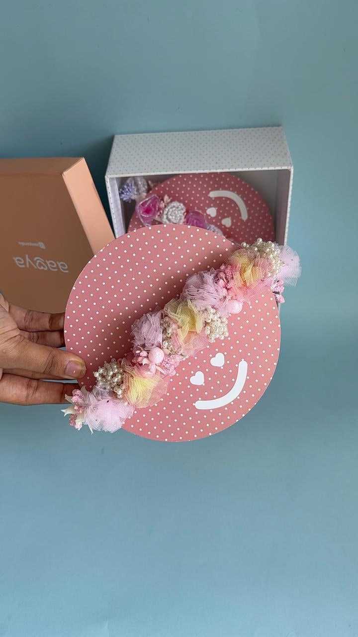 The Lucy Tiara is a delightful handmade accessory crafted from delicate net fabric with a soft band for comfortable wear. Featuring a charming mix of baby pink and yellow hues, it’s adorned with elegant pearls that add a touch of sparkle. Perfect for bringing a playful and sweet vibe to any outfit!