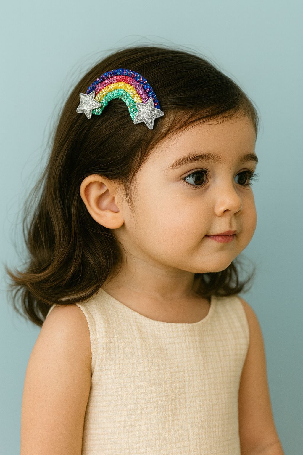Add a splash of sparkle to your look with this glittery rainbow hairclip adorned with twinkling stars. Lightweight and fun, it’s perfect for dancing through parties or brightening up any day with a playful shine.